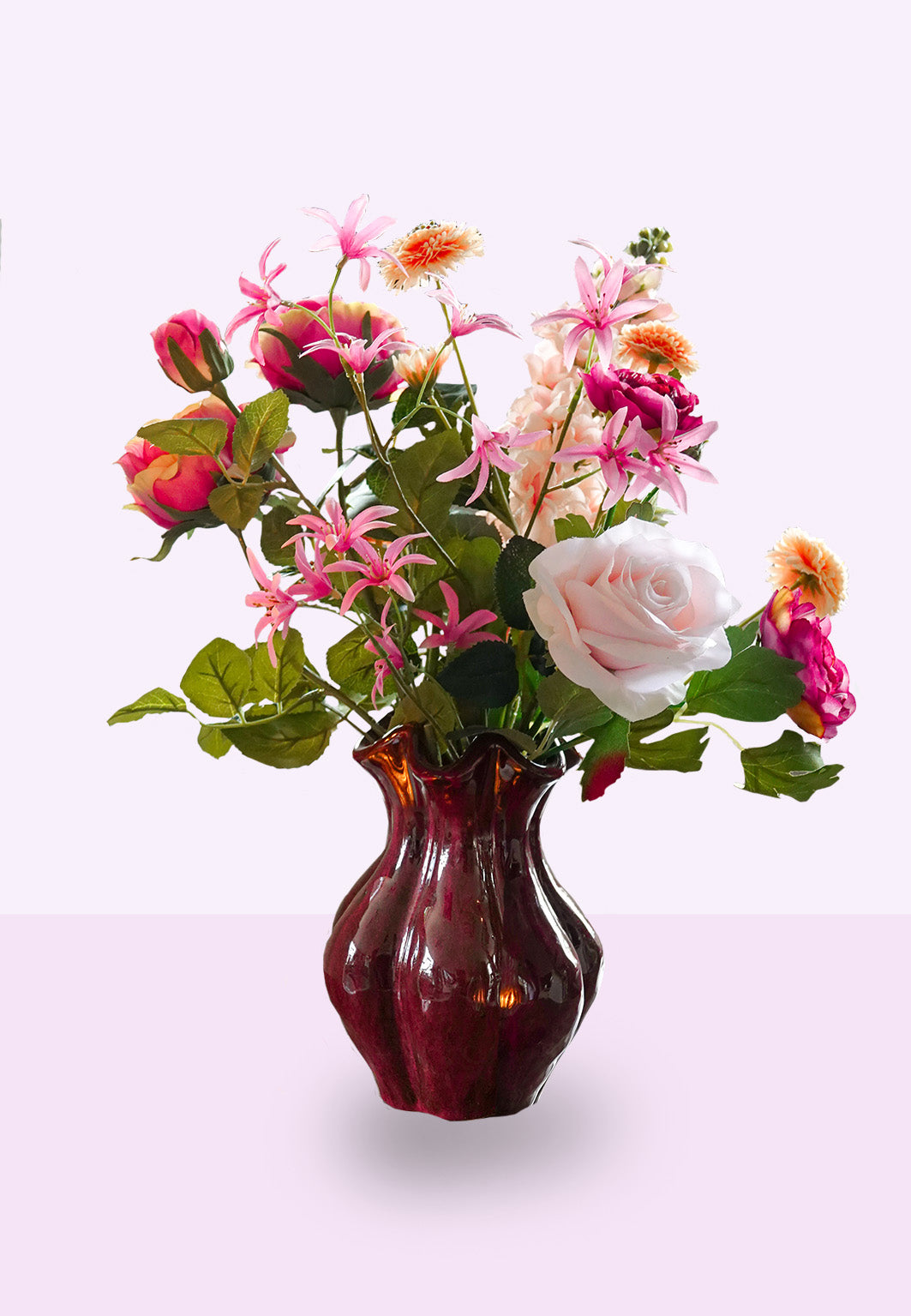 Ideaal voor op je koffietafel is set Fransie dé aanvulling voor jouw interieur. Je shopt dit boeket inclusief vaas. Door de verschillende roze tinten is het een tijdloos boeket wat het hele jaar door kan blijven staan.